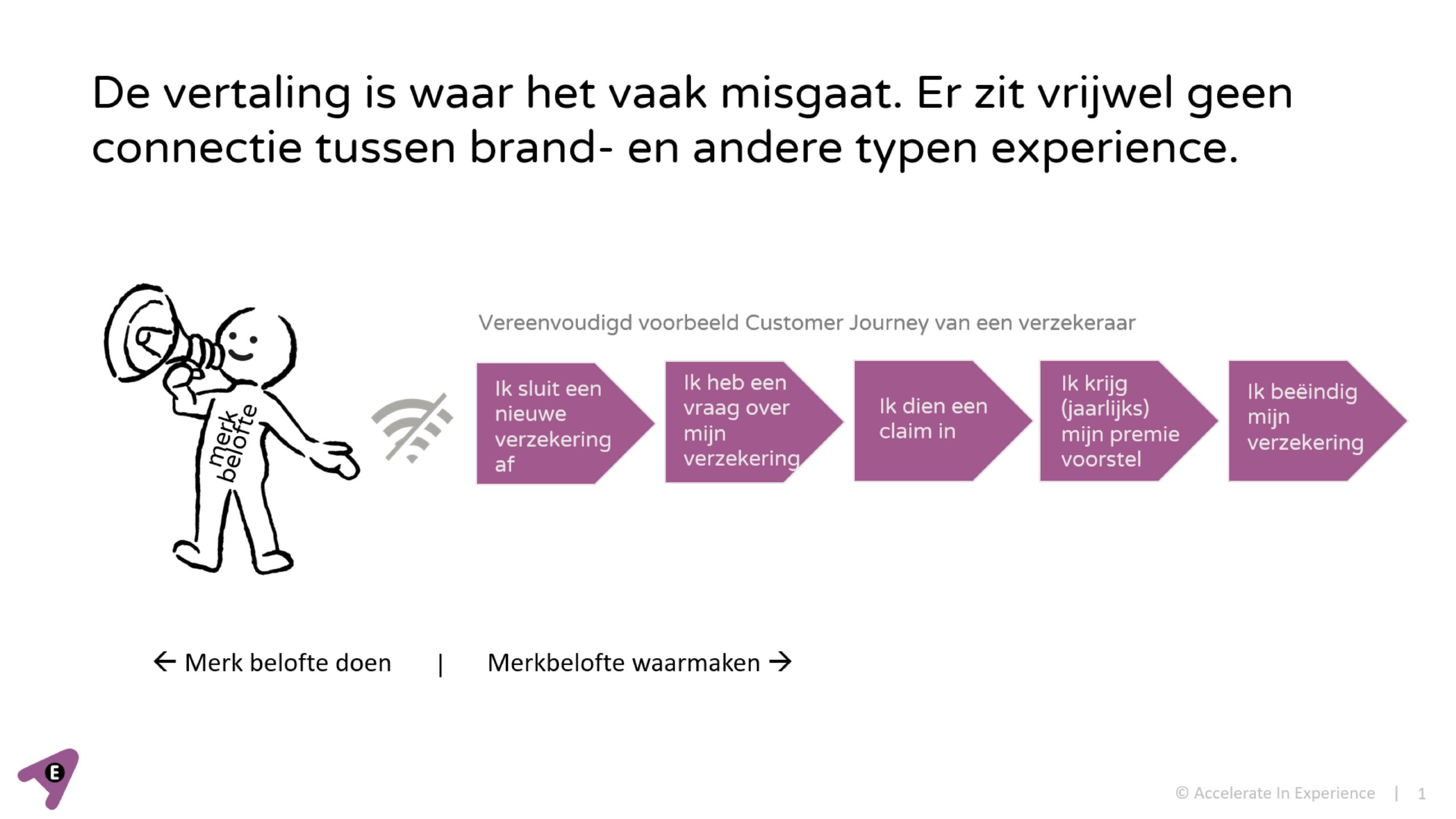 Een van de belangrijkste uitdagingen voor merkbeleving is dat er teveel focus zit op merkbelofte en te weinig op het waarmaken van die belofte. Stel dat de belofte van deze verzekeraar is ‘We staan altijd voor je klaar’. Wat betekent deze belofte voor iedere stap in de journey van de klanten? Wat betekent ‘voor me klaarstaan’ als ik online het aanvraagformulier invul? Wat betekent ‘voor me klaar staan’ als ik een schadeclaim indien?