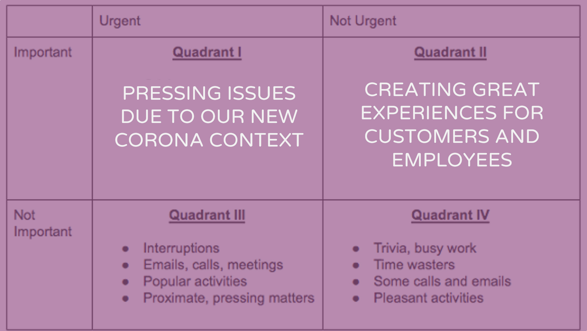 The misconception being, that urgent, important issues (focus on sales, cost reduction), are separate from not urgent important issues (a good customer and employee experience).