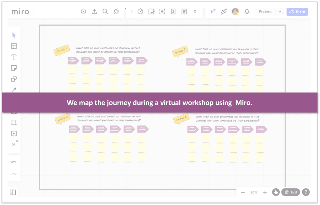 During a 2.5 hour workshop we map the transactional ánd emotional journey with employees representing all departments.