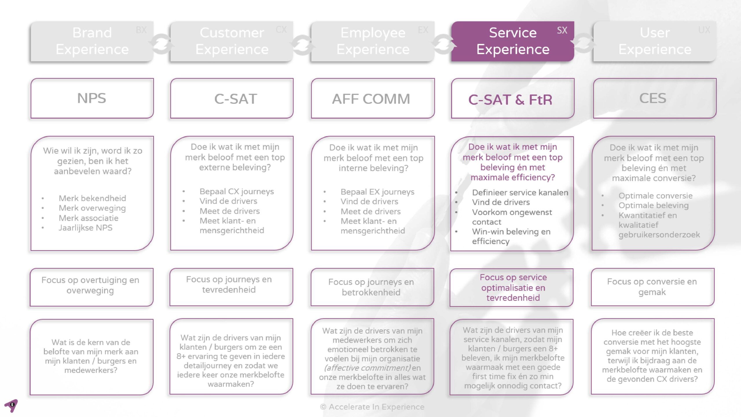 In de complete Accelerate In Experience training vind je de module Service Experience als een van de 5 typen beleving. Wil je specifiek aan de slag met alleen service experience? Dan kun je ook de module Service Experience los volgen.
